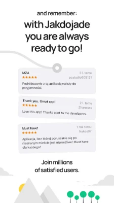 Ar kada nors teko susimąstyti, kaip patogiausiai pasiekti norimą vietą Lenkijoje, ar tai būtų miestas, ar tolimas regionas? „Jakdojade" yra jūsų patikimas gidas, sukurtas sklandžioms kelionėms viešuoju transportu ir traukiniais visoje šalyje. Tai išmani platforma, vienijanti tiksliausius miesto transporto tvarkaraščius – nuo autobusų, tramvajų ir troleibusų iki metro ir regioninių geležinkelių – kartu su išsamiu tarpmiestinių traukinių maršrutų (įskaitant PKP Intercity, POLREGIO ir daugelį kitų operatorių) planavimu. Pamirškite spėliones ir vėlavimus – su „Jakdojade" kiekviena jūsų kelionė prasidės ir baigsis pagal planą.